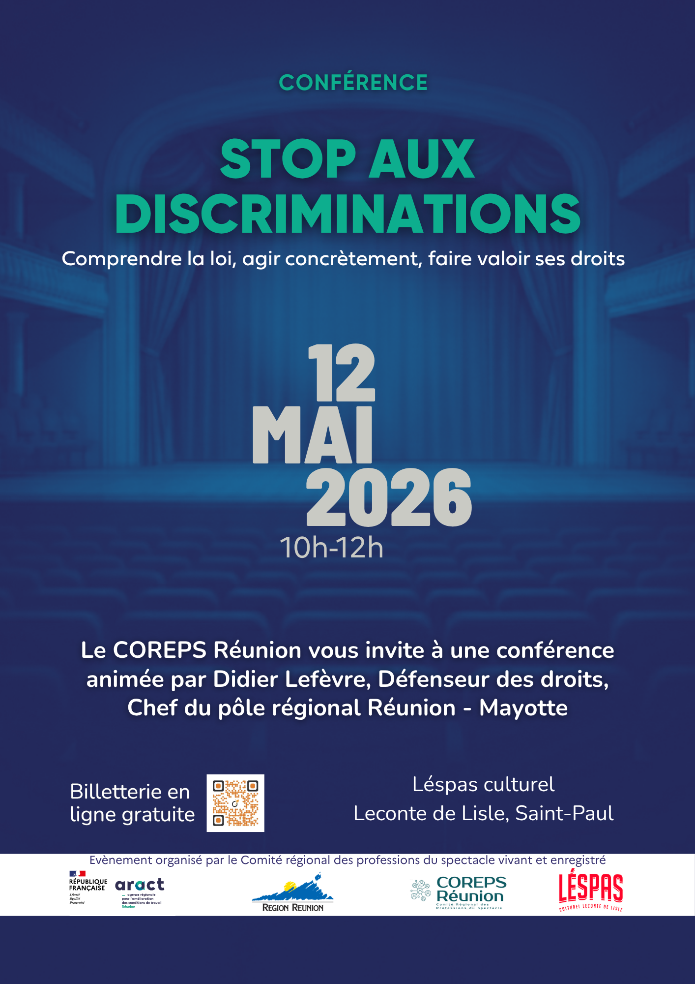 Le COREPS Réunion (Comité régional des professions du spectacle vivant et enregistré) agit pour améliorer les conditions d’emploi et de travail des professionnels du spectacle. À travers ses actions, il favorise le dialogue social, la professionnalisation des acteurs et la prise en compte des enjeux d’égalité, de respect des droits et de prévention des discriminations.